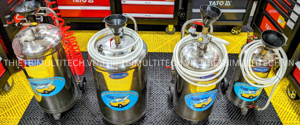 Pha dung dịch: Đổ nước sạch vào bình (khoảng 3/4 bình), sau đó đổ hóa chất rửa xe theo đúng tỉ lệ khuyến cáo qua phễu đi kèm.