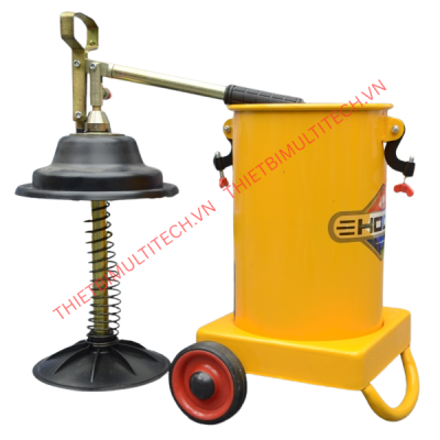 Bước 1: Nạp mỡ. Mở khóa nắp thùng, lấy cụm bơm và tấm ép ra. Đổ mỡ vào thùng chứa (tối đa 12L).
