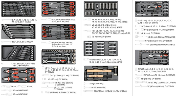 177 món dụng cụ trong tủ được sắp xếp gọn gàng trong các khay nhựa định hình, bao quát mọi nhu cầu sửa chữa cơ bản đến chuyên sâu: